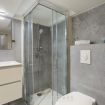 Studio fleur ein kleines Juwel in einem Gebäude aus den 1930er Jahren, modernes Interieur, 20 m² auf zwei Ebenen, Küche, Wohnzimmer und Bad auf der ersten Ebene, Schlafzimmer über eine Innentreppe erreichbar.