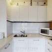 Cuisine équipée d'un grand réfrigérateur et d'un lit pliant très confortable pour une troisième personne, et un canapé-lit