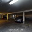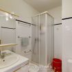 Salle de bain avec grande douche et un parking privé accessible par ascenseur direct.